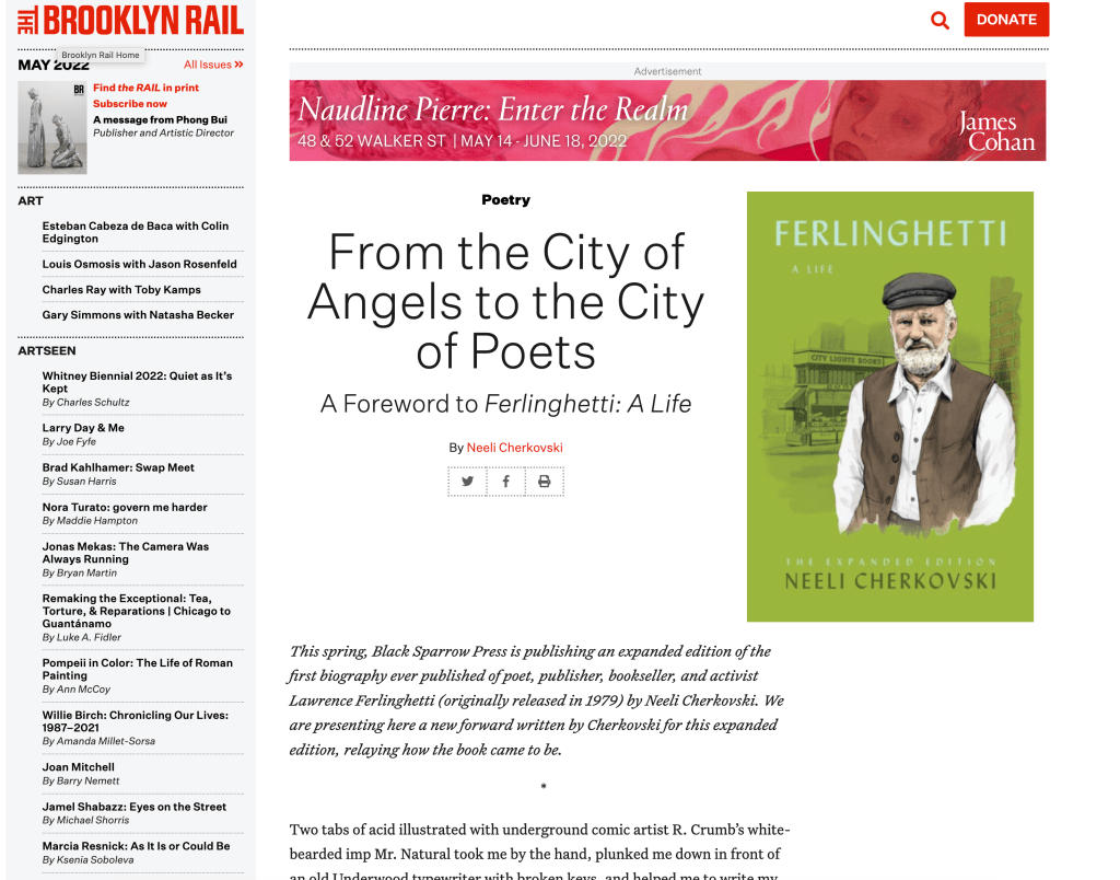Neeli Cherkovski’s new forward for the expanded edition of his biography, Ferlinghetti, appears in the Brooklyn Rail. To read more please CLICK HERE!